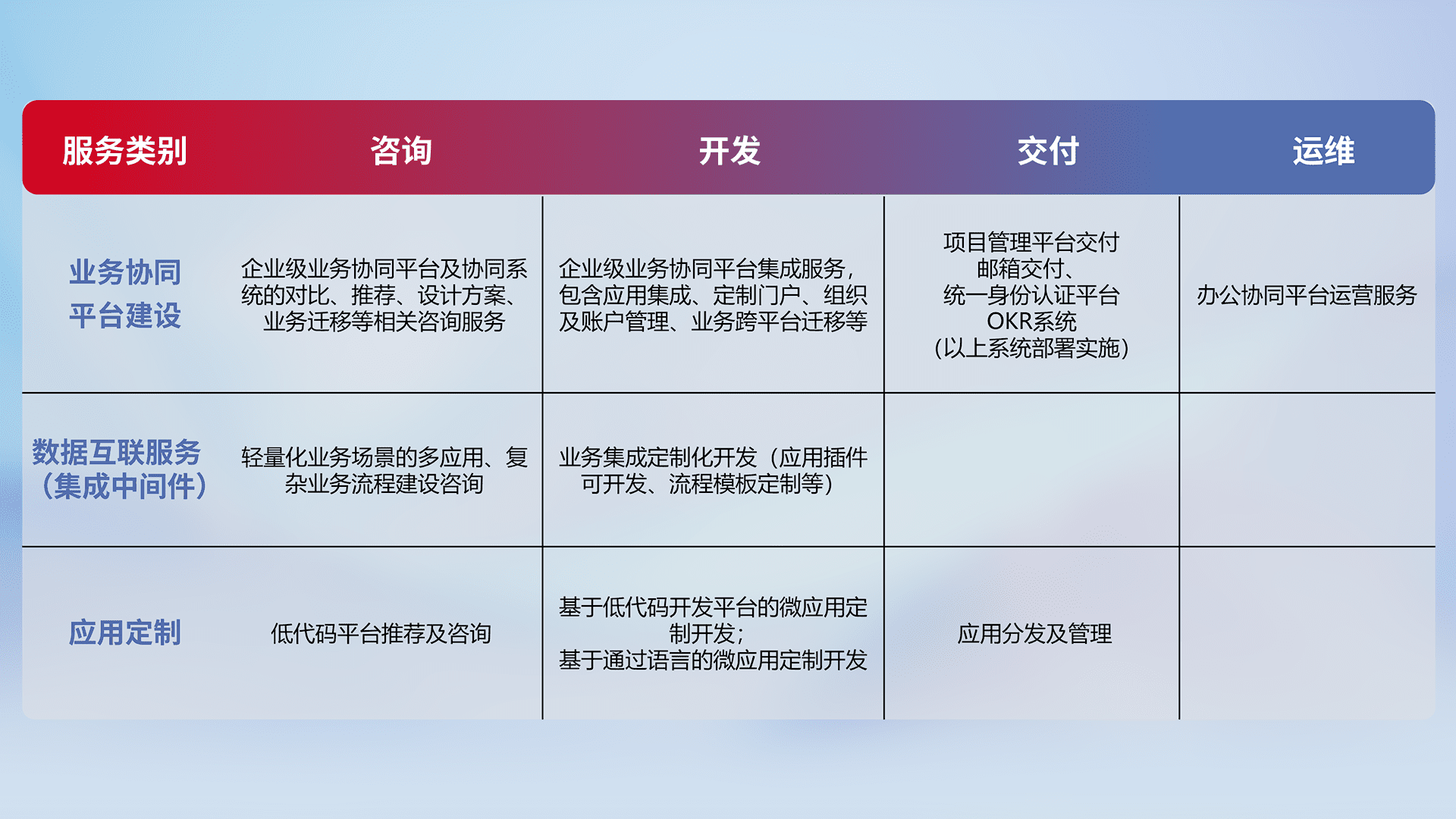 针对钉钉、、企微、、、、IDaas等平台级产品提供产品的规划、、、方案、、交付、、定制化开发等服务,,实现如统一协同办公、、、、智能客户服务、、混合会议管理、、、智能数据查询、、、等业务场景,,,实现数字化转型。。